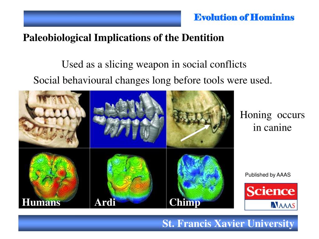 Evolution of Hominins Paleobiological Implications of the Dentition Used as a slicing weapon in social conflicts Social behavioural changes long before tools were used. Honing occurs in canine Published by AAAS Humans Ardi Chimp St. Francis Xavier University