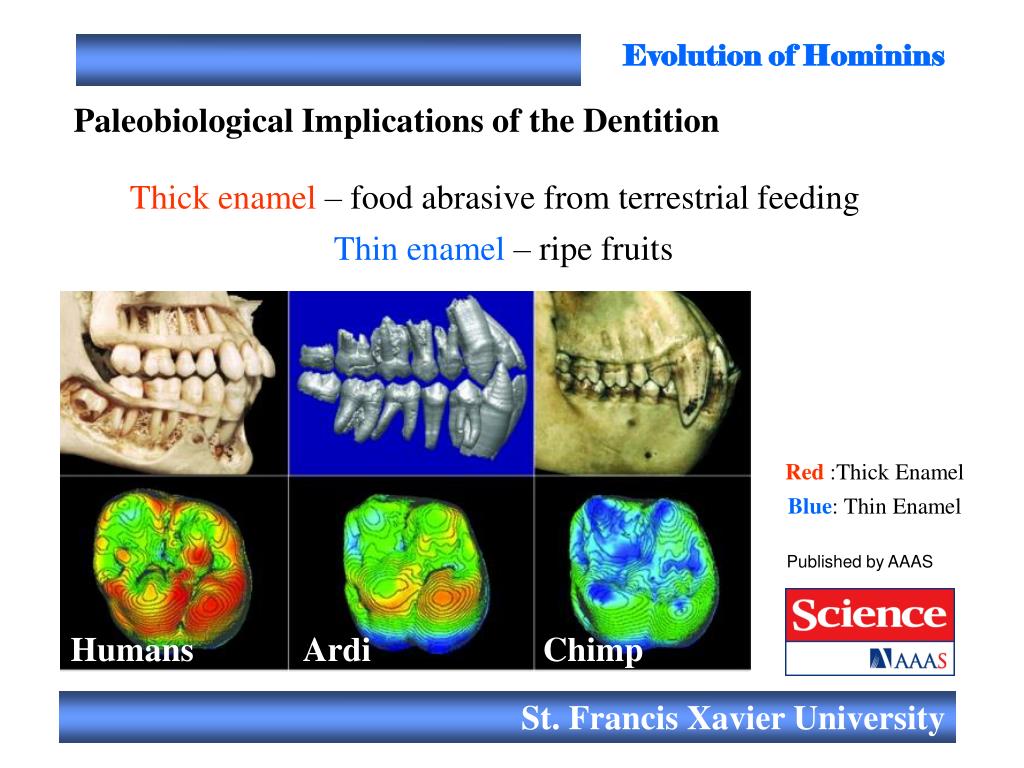 Evolution of Hominins Paleobiological Implications of the Dentition Thick enamel – food abrasive from terrestrial feeding Thin enamel – ripe fruits Red :Thick Enamel Blue: Thin Enamel Published by AAAS Humans Ardi Chimp St. Francis Xavier University