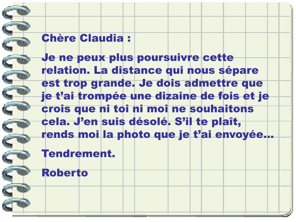 Chère Claudia : Je ne peux plus poursuivre cette relation. La distance qui nous sépare est trop grande. Je dois admettre que je t’ai trompée une dizaine de fois et je crois que ni toi ni moi ne souhaitons cela. J’en suis désolé. S’il te plaît, rends moi la photo que je t’ai envoyée... Tendrement. Roberto