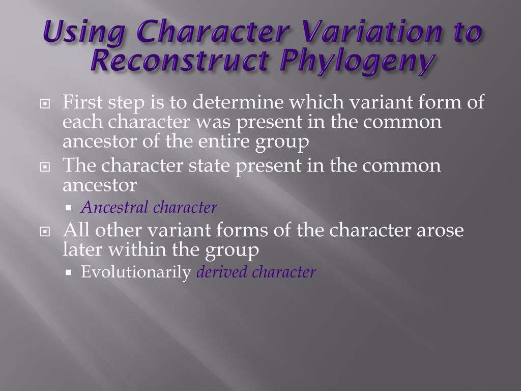 Using Character Variation to Reconstruct Phylogeny • First step is to determine which variant form of each character was present in the common ancestor of the entire group • The character state present in the common ancestor • Ancestral character • All other variant forms of the character arose later within the group • Evolutionarily derived character