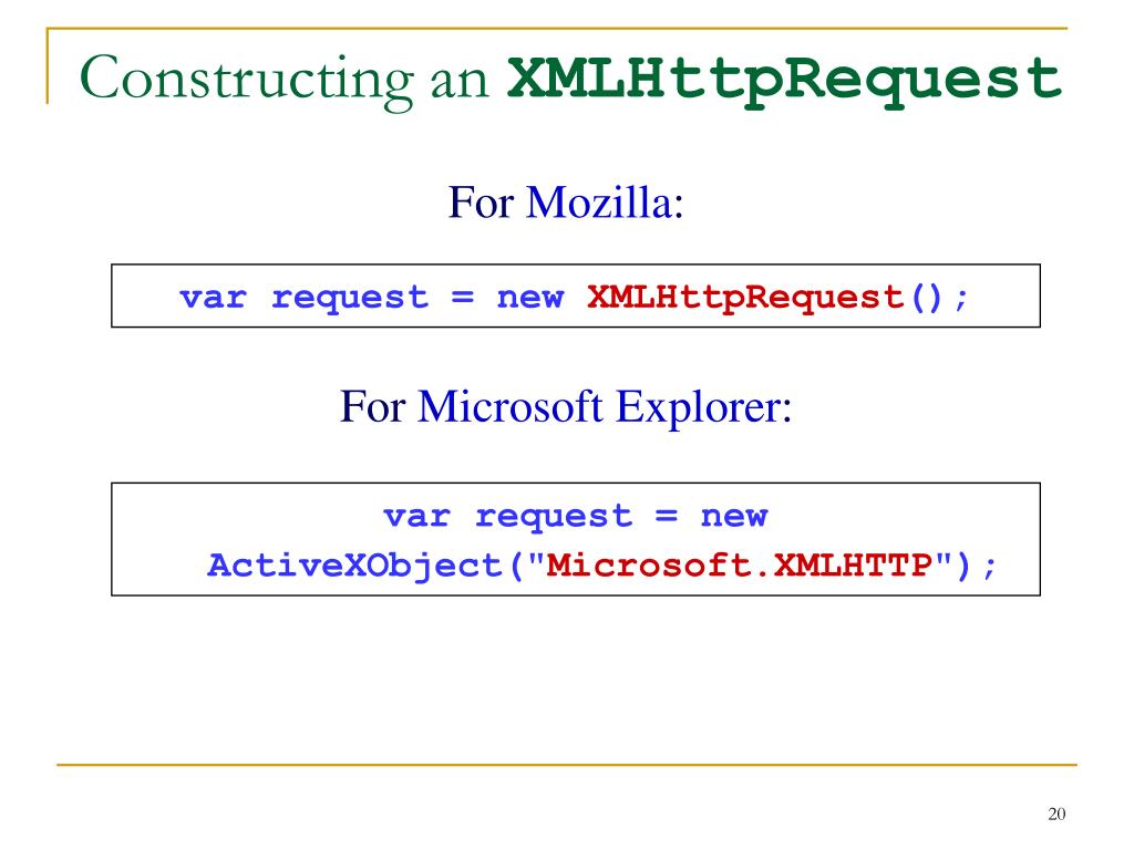 Constructing an XMLHttpRequest For Mozilla: For Microsoft Explorer: var request = newXMLHttpRequest(); var request = new ActiveXObject("Microsoft.XMLHTTP");