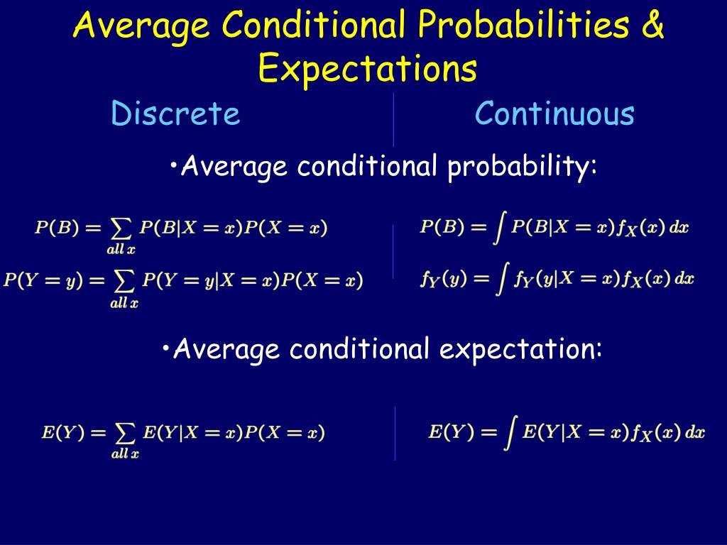 Average Conditional Probabilities & ExpectationsDiscrete Continuous • Average conditional probability: • Average conditional expectation: