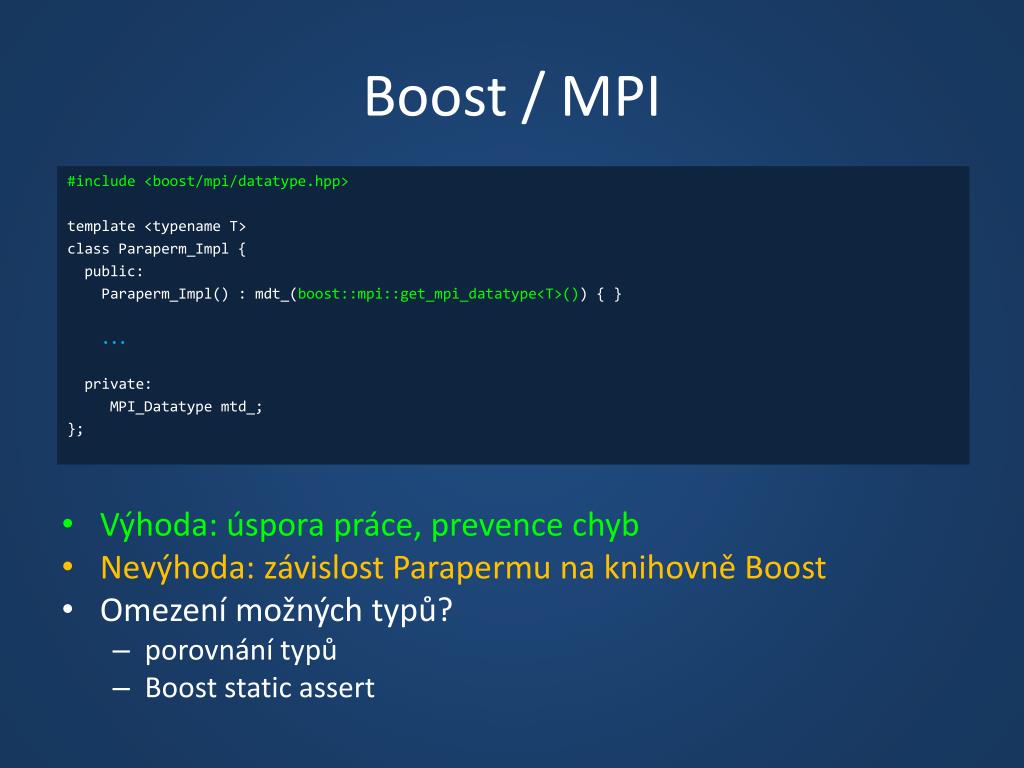 Boost / MPI #include <boost/mpi/datatype.hpp> template <typename T> class Paraperm_Impl { public: Paraperm_Impl() : mdt_(boost::mpi::get_mpi_datatype<T>()) { } ... private: MPI_Datatype mtd_; }; • Výhoda: úspora práce, prevence chyb • Nevýhoda: závislost Parapermu na knihovně Boost • Omezení možných typů? • porovnání typů • Boost static assert