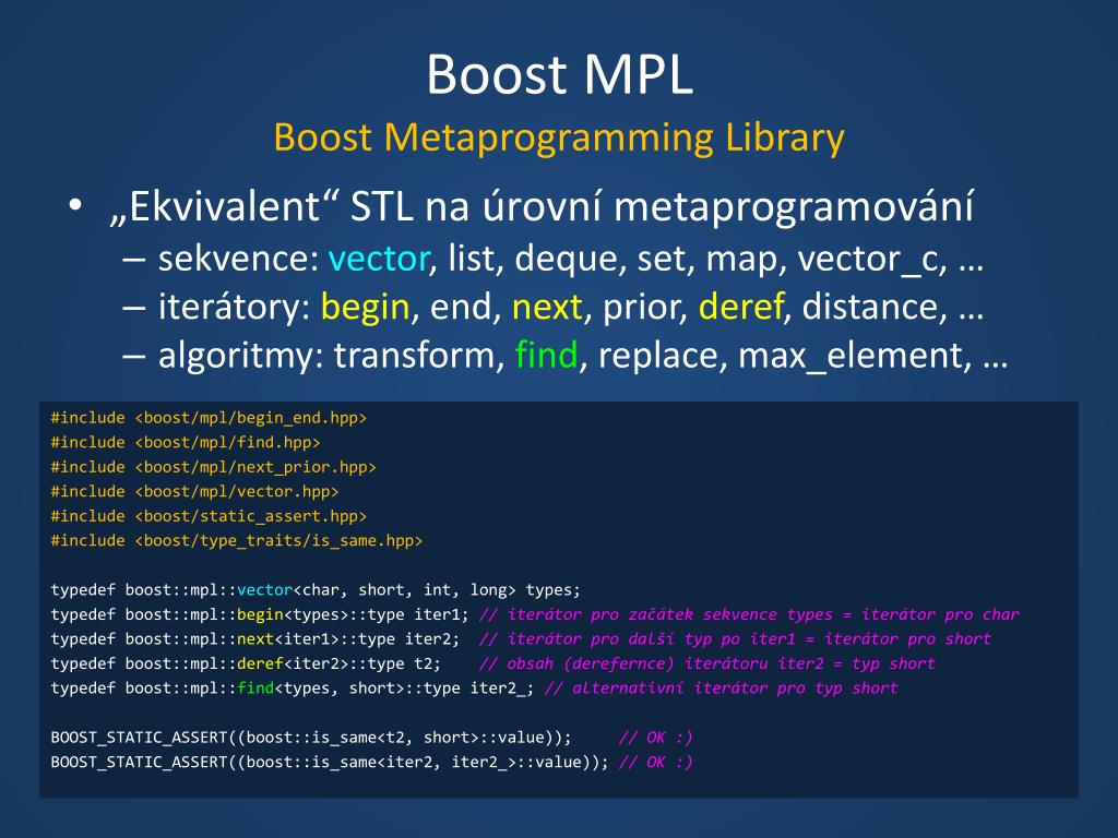 Boost MPLBoost Metaprogramming Library • „Ekvivalent“ STL na úrovní metaprogramování • sekvence: vector, list, deque, set, map, vector_c, … • iterátory: begin, end, next, prior, deref, distance, … • algoritmy: transform, find, replace, max_element, … #include <boost/mpl/begin_end.hpp> #include <boost/mpl/find.hpp> #include <boost/mpl/next_prior.hpp> #include <boost/mpl/vector.hpp> #include <boost/static_assert.hpp> #include <boost/type_traits/is_same.hpp> typedef boost::mpl::vector<char, short, int, long> types; typedef boost::mpl::begin<types>::type iter1;// iterátor pro začátek sekvence types = iterátor pro char typedef boost::mpl::next<iter1>::type iter2;// iterátor pro další typ po iter1 = iterátor pro short typedef boost::mpl::deref<iter2>::type t2;// obsah (derefernce) iterátoru iter2 = typ short typedef boost::mpl::find<types, short>::type iter2_;// alternativní iterátor pro typ short BOOST_STATIC_ASSERT((boost::is_same<t2, short>::value)); // OK :) BOOST_STATIC_ASSERT((boost::is_same<iter2, iter2_>::value)); // OK :)