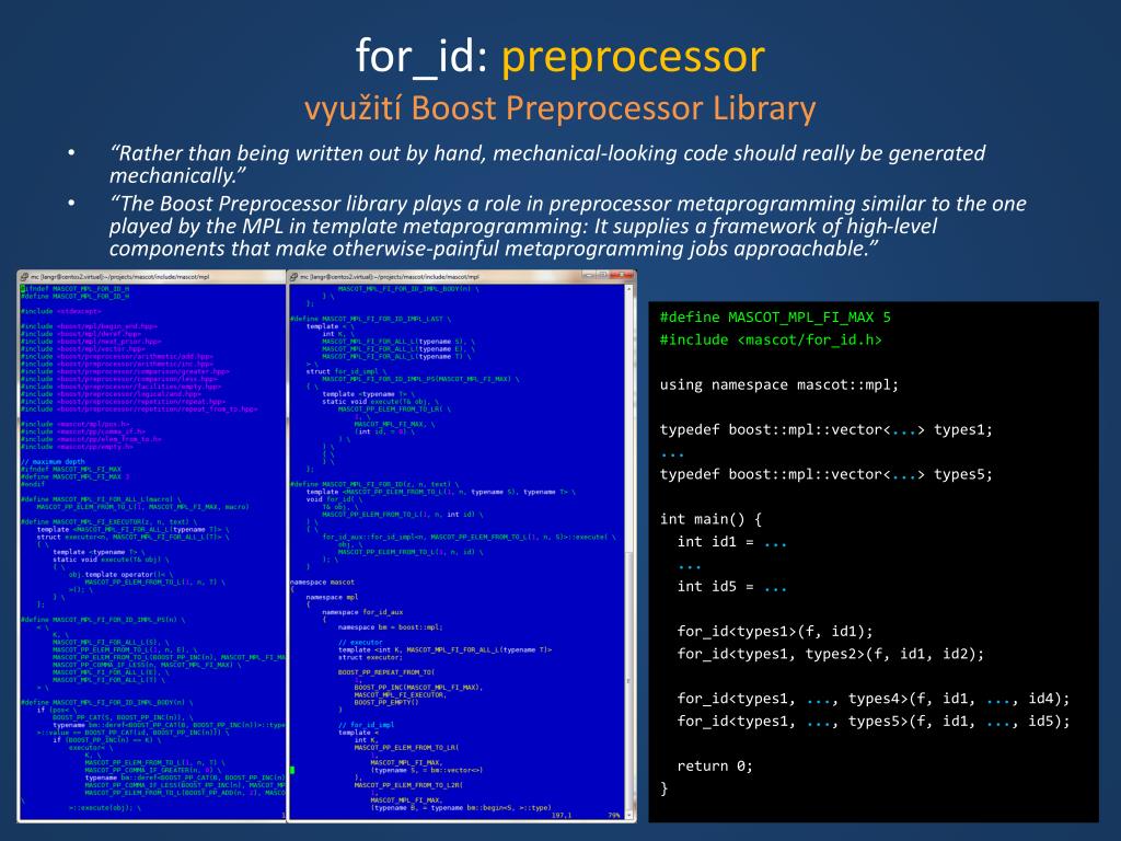 for_id: preprocessorvyužití Boost Preprocessor Library • “Rather than being written out by hand, mechanical-looking code should really be generated mechanically.” • “The Boost Preprocessor library plays a role in preprocessor metaprogramming similar to the one played by the MPL in template metaprogramming: It supplies a framework of high-level components that make otherwise-painful metaprogramming jobs approachable.” #define MASCOT_MPL_FI_MAX 5 #include <mascot/for_id.h> using namespace mascot::mpl; typedef boost::mpl::vector<...> types1; ... typedef boost::mpl::vector<...> types5; int main() { int id1 = ... ... int id5 = ... for_id<types1>(f, id1); for_id<types1, types2>(f, id1, id2); for_id<types1, ..., types4>(f, id1, ..., id4); for_id<types1, ..., types5>(f, id1, ..., id5); return 0; }