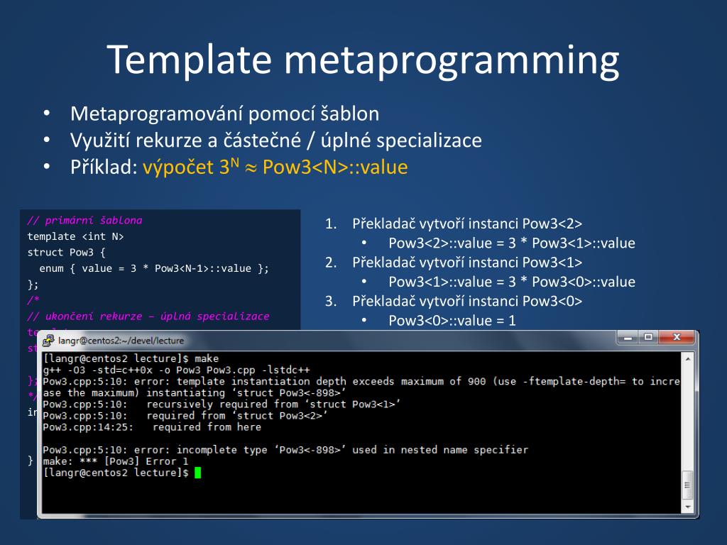 Template metaprogramming • Metaprogramování pomocí šablon • Využití rekurze a částečné / úplné specializace • Příklad: výpočet 3N Pow3<N>::value // primární šablona template <int N> struct Pow3 { enum { value = 3 * Pow3<N-1>::value }; }; // ukončení rekurze – úplná specializace template<> struct Pow3<0> { enum { value = 1 }; }; int main() { std::cout << Pow3<2>::value << std::endl; return 0; } // primární šablona template <int N> struct Pow3 { enum { value = 3 * Pow3<N-1>::value }; }; /* // ukončení rekurze – úplná specializace template<> struct Pow3<0> { enum { value = 1 }; }; */ int main() { std::cout << Pow3<2>::value << std::endl; return 0; } • Překladač vytvoří instanci Pow3<2> • Pow3<2>::value = 3 * Pow3<1>::value • Překladač vytvoří instanci Pow3<1> • Pow3<1>::value = 3 * Pow3<0>::value • Překladač vytvoří instanci Pow3<0> • Pow3<0>::value = 1 • Zpětné dosazení • Pow3<1>::value = 3 * 1 = 3 • Pow3<2>::value = 3 * 3 = 9 • Výraz Pow3<2> je vyhodnocen v čase překladu • Instance Pow3 nejsou v čase běhu programu vůbec potřeba