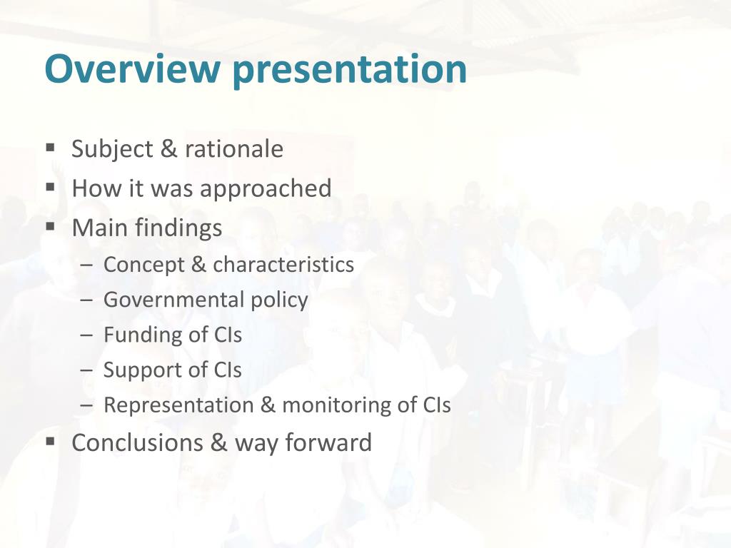 Overview presentation • Subject & rationale • How it was approached • Main findings • Concept & characteristics • Governmental policy • Funding of CIs • Support of CIs • Representation & monitoring of CIs • Conclusions & way forward