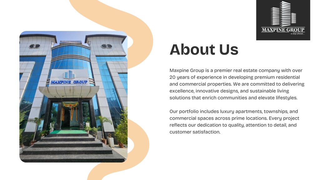 2. About Us Maxpine Group is a premier real estate company with over 20 years of experience in developing premium residential and commercial properties. We are committed to delivering excellence, innovative designs, and sustainable living solutions that enrich communities and elevate lifestyles. Our portfolio includes luxury apartments, townships, and commercial spaces across prime locations. Every project reflects our dedication to quality, attention to detail, and customer satisfaction.