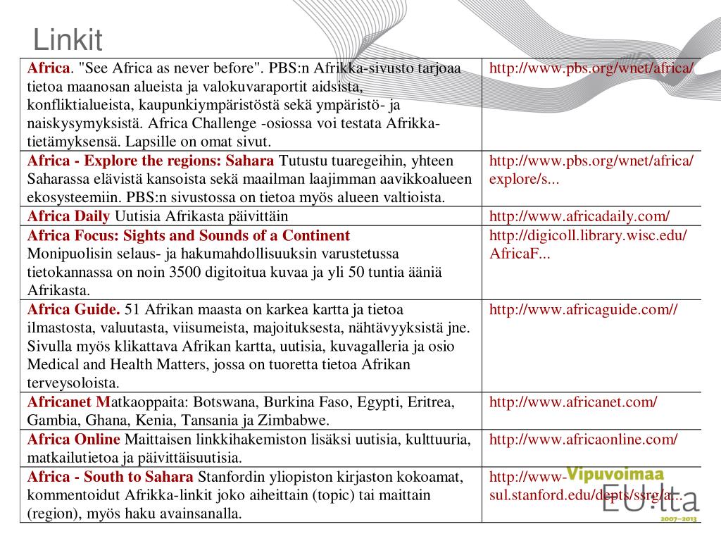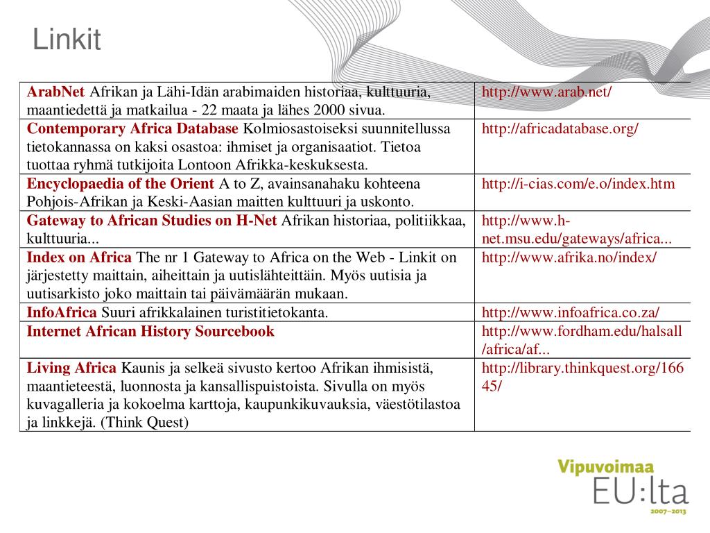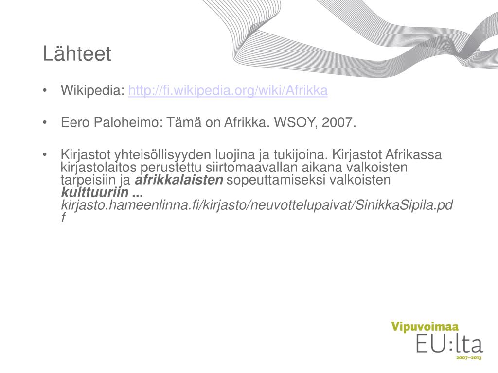 Lähteet • Wikipedia: http://fi.wikipedia.org/wiki/Afrikka • Eero Paloheimo: Tämä on Afrikka. WSOY, 2007. • Kirjastot yhteisöllisyyden luojina ja tukijoina. Kirjastot Afrikassa kirjastolaitos perustettu siirtomaavallan aikana valkoisten tarpeisiin ja afrikkalaisten sopeuttamiseksi valkoisten kulttuuriin...kirjasto.hameenlinna.fi/kirjasto/neuvottelupaivat/SinikkaSipila.pdf