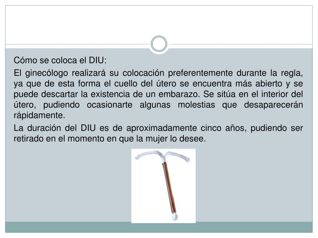 Cómo se coloca el DIU: El ginecólogo realizará su colocación preferentemente durante la regla, ya que de esta forma el cuello del útero se encuentra más abierto y se puede descartar la existencia de un embarazo. Se sitúa en el interior del útero, pudiendo ocasionarte algunas molestias que desaparecerán rápidamente. La duración del DIU es de aproximadamente cinco años, pudiendo ser retirado en el momento en que la mujer lo desee.
