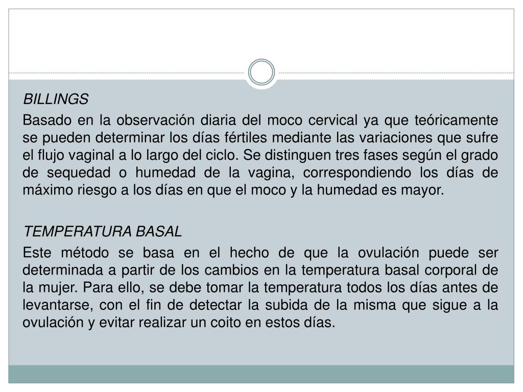 BILLINGS Basado en la observación diaria del moco cervical ya que teóricamente se pueden determinar los días fértiles mediante las variaciones que sufre el flujo vaginal a lo largo del ciclo. Se distinguen tres fases según el grado de sequedad o humedad de la vagina, correspondiendo los días de máximo riesgo a los días en que el moco y la humedad es mayor. TEMPERATURA BASAL Este método se basa en el hecho de que la ovulación puede ser determinada a partir de los cambios en la temperatura basal corporal de la mujer. Para ello, se debe tomar la temperatura todos los días antes de levantarse, con el fin de detectar la subida de la misma que sigue a la ovulación y evitar realizar un coito en estos días.