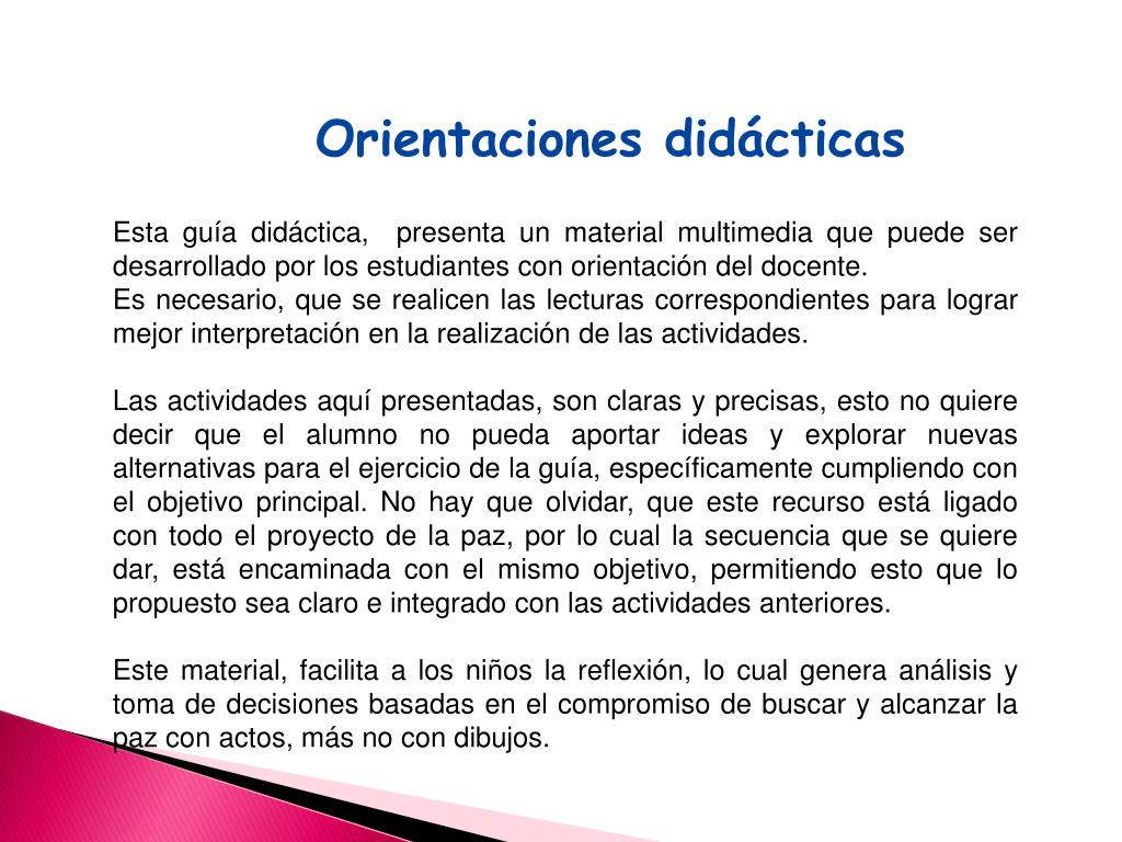 Orientaciones didácticas Esta guía didáctica, presenta un material multimedia que puede ser desarrollado por los estudiantes con orientación del docente. Es necesario, que se realicen las lecturas correspondientes para lograr mejor interpretación en la realización de las actividades. Las actividades aquí presentadas, son claras y precisas, esto no quiere decir que el alumno no pueda aportar ideas y explorar nuevas alternativas para el ejercicio de la guía, específicamente cumpliendo con el objetivo principal. No hay que olvidar, que este recurso está ligado con todo el proyecto de la paz, por lo cual la secuencia que se quiere dar, está encaminada con el mismo objetivo, permitiendo esto que lo propuesto sea claro e integrado con las actividades anteriores. Este material, facilita a los niños la reflexión, lo cual genera análisis y toma de decisiones basadas en el compromiso de buscar y alcanzar la paz con actos, más no con dibujos.