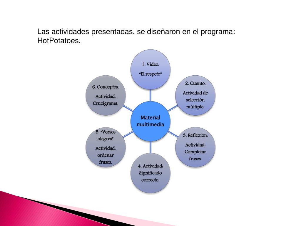 Todas las actividades están diseñadas en el programa de HotPotatoes, las cuales solo con pulsar las imágenes o botones indicados permiten desarrollar las actividades propuestas. También se presentan hipervínculos para navegar por la presentación. Las actividades presentadas, contienen diferentes alternativas en relación al tiempo, manejo de respuestas y corrección, con el propósito de que el estudiante tenga claro los análisis y conceptos.