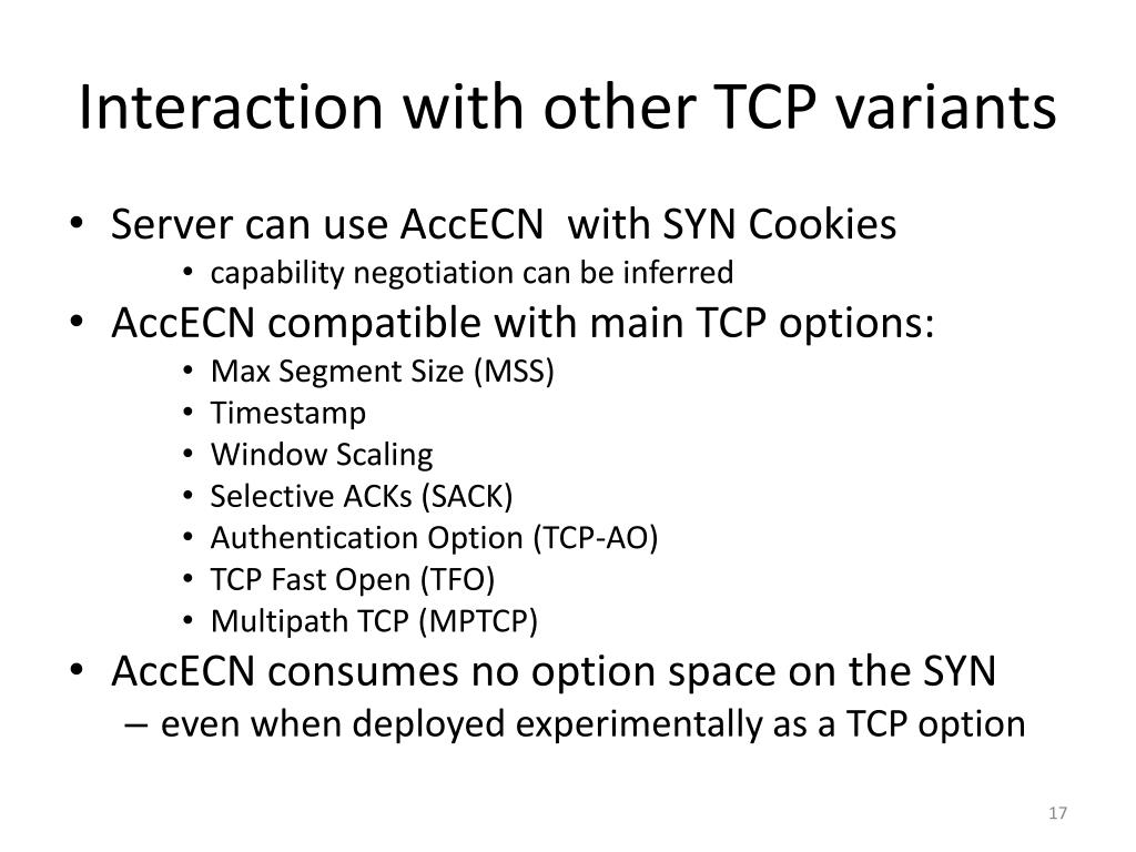 Interaction with other TCP variants • Server can use AccECN with SYN Cookies • capability negotiation can be inferred • AccECN compatible with main TCP options: • Max Segment Size (MSS) • Timestamp • Window Scaling • Selective ACKs (SACK) • Authentication Option (TCP-AO) • TCP Fast Open (TFO) • Multipath TCP (MPTCP) • AccECN consumes no option space on the SYN • even when deployed experimentally as a TCP option