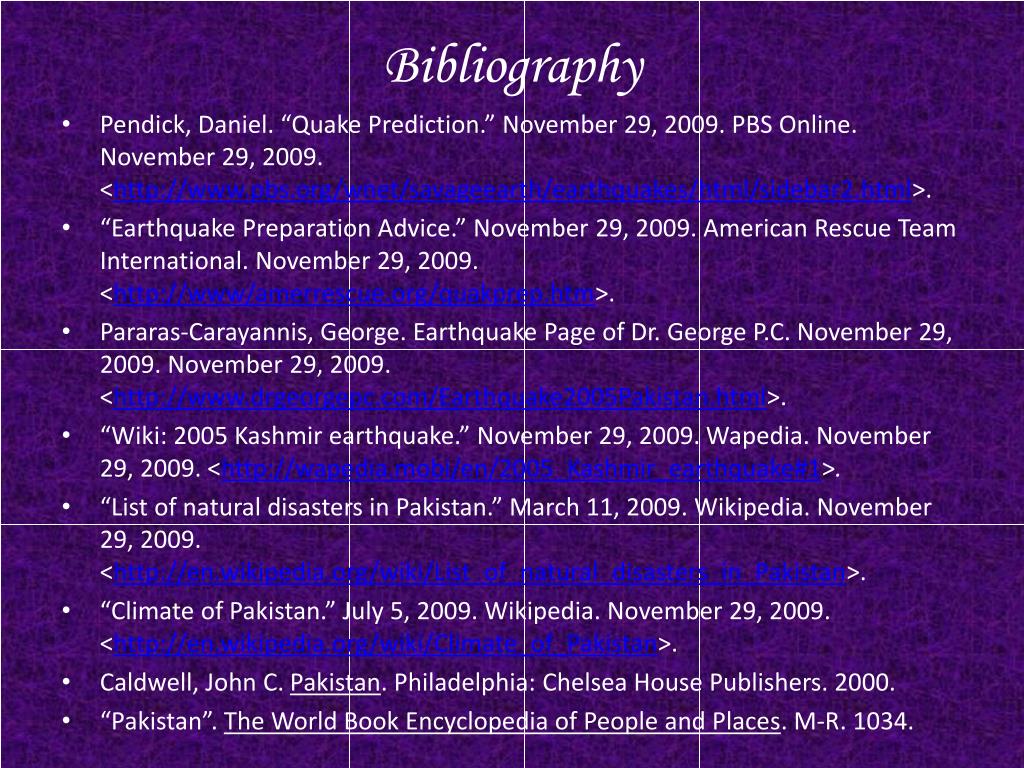 Bibliography • Pendick, Daniel. “Quake Prediction.” November 29, 2009. PBS Online. November 29, 2009. <http://www.pbs.org/wnet/savageearth/earthquakes/html/sidebar2.html>. • “Earthquake Preparation Advice.” November 29, 2009. American Rescue Team International. November 29, 2009. <http://www/amerrescue.org/quakprep.htm>. • Pararas-Carayannis, George. Earthquake Page of Dr. George P.C. November 29, 2009. November 29, 2009. <http://www.drgeorgepc.com/Earthquake2005Pakistan.html>. • “Wiki: 2005 Kashmir earthquake.” November 29, 2009. Wapedia. November 29, 2009.<http://wapedia.mobi/en/2005_Kashmir_earthquake#1>. • “List of natural disasters in Pakistan.” March 11, 2009. Wikipedia. November 29, 2009.<http://en.wikipedia.org/wiki/List_of_natural_disasters_in_Pakistan>. • “Climate of Pakistan.” July 5, 2009. Wikipedia. November 29, 2009. <http://en.wikipedia.org/wiki/Climate_of_Pakistan>. • Caldwell, John C. Pakistan. Philadelphia: Chelsea House Publishers. 2000. • “Pakistan”. The World Book Encyclopedia of People and Places. M-R. 1034.