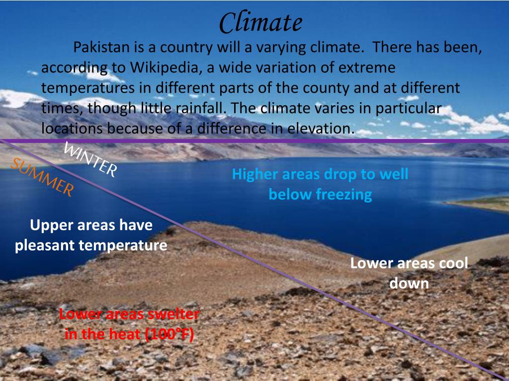 Climate Pakistan is a country will a varying climate. There has been, according to Wikipedia, a wide variation of extreme temperatures in different parts of the county and at different times, though little rainfall. The climate varies in particular locations because of a difference in elevation. WINTER Higher areas drop to well below freezing SUMMER Upper areas have pleasant temperature Lower areas cool down Lower areas swelter in the heat (100°F)