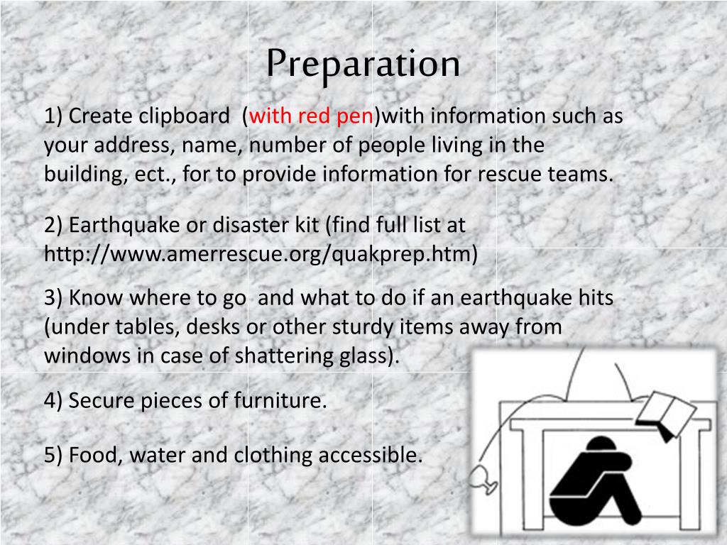 Preparation 1) Create clipboard (with red pen)with information such as your address, name, number of people living in the building, ect., for to provide information for rescue teams. 2) Earthquake or disaster kit (find full list at http://www.amerrescue.org/quakprep.htm) 3) Know where to go and what to do if an earthquake hits (under tables, desks or other sturdy items away from windows in case of shattering glass). 4) Secure pieces of furniture. • 5) Food, water and clothing accessible.