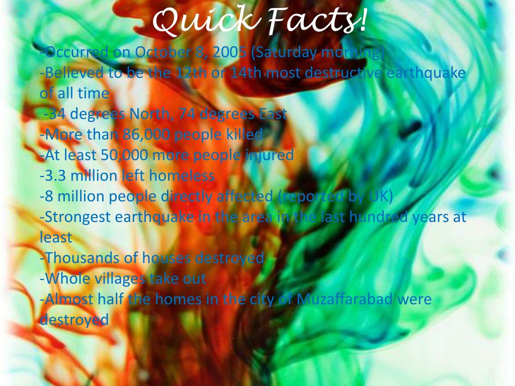 Quick Facts! • -Occurred on October 8, 2005 (Saturday morning) • Believed to be the 12th or 14th most destructive earthquake of all time -34 degrees North, 74 degrees East • More than 86,000 people killed-At least 50,000 more people injured • 3.3 million left homeless-8 million people directly affected (reported by UK) • Strongest earthquake in the area in the last hundred years at least-Thousands of houses destroyed-Whole villages take out • Almost half the homes in the city of Muzaffarabad were destroyed