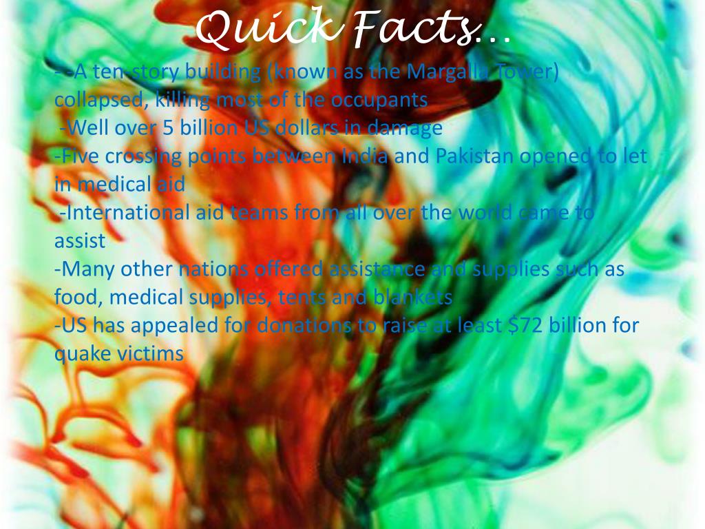 Quick Facts… • - -A ten-story building (known as the Margalla Tower) collapsed, killing most of the occupants -Well over 5 billion US dollars in damage • Five crossing points between India and Pakistan opened to let in medical aid -International aid teams from all over the world came to assist • -Many other nations offered assistance and supplies such as food, medical supplies, tents and blankets -US has appealed for donations to raise at least $72 billion for quake victims