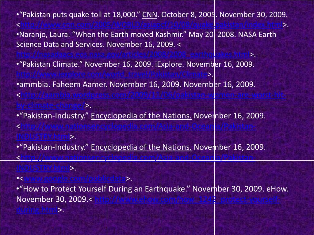 “Pakistan puts quake toll at 18,000.” CNN. October 8, 2005. November 30, 2009. <http://www.cnn.com/2005/WORLD/asiapcf/10/08/quake.pakistan/index.html>. • Naranjo, Laura. “When the Earth moved Kashmir.” May 20, 2008. NASA Earth Science Data and Services. November 16, 2009. < http://nasadaacs.eos.nasa.gov/articles/2008/2008_earthquakes.html>. • “Pakistan Climate.” November 16, 2009. iExplore. November 16, 2009. http://www.iexplore.com/world_travel/Pakistan/Climate>. • ammbia. FaheemAamer. November 16, 2009. November 16, 2009. <http://aambia.wordpress.com/2009/11/06/pakistan-women-are-worst-hit-by-climate-change/>. • “Pakistan-Industry.” Encyclopedia of the Nations. November 16, 2009. <http://www.nationsencyclopedia.com/Asia-and-Oceania/Pakistan-INDUSTRY.html>. • “Pakistan-Industry.” Encyclopedia of the Nations. November 16, 2009. <http://www.nationsencyclopedia.com/Asia-and-Oceania/Pakistan-INDUSTRY.html>. • <www.google.com/publicdata>. • “How to Protect Yourself During an Earthquake.” November 30, 2009. eHow. November 30, 2009.< http://www.ehow.com/how_1242_protect-yourself-during.html>.