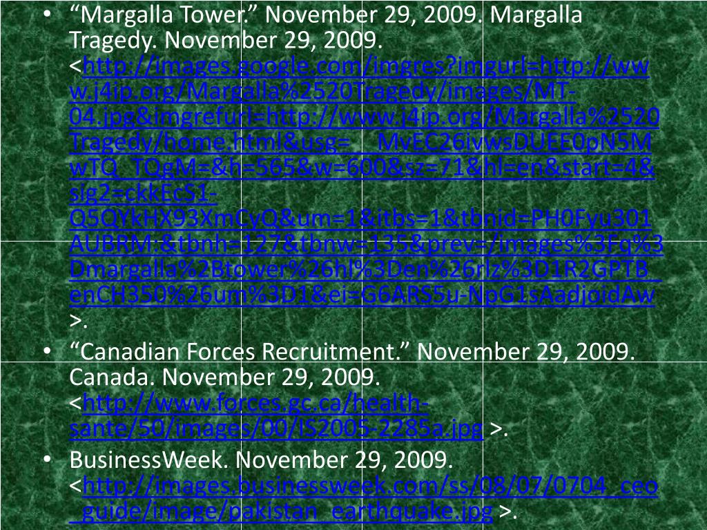 “Margalla Tower.” November 29, 2009. Margalla Tragedy. November 29, 2009. <http://images.google.com/imgres?imgurl=http://www.j4ip.org/Margalla%2520Tragedy/images/MT-04.jpg&imgrefurl=http://www.j4ip.org/Margalla%2520Tragedy/home.html&usg=__MvEC26ivwsDUEE0pN5MwTQ_TQgM=&h=565&w=600&sz=71&hl=en&start=4&sig2=ckkEcS1-Q5QYkHX93XmCyQ&um=1&itbs=1&tbnid=PH0Fyu301AUBRM:&tbnh=127&tbnw=135&prev=/images%3Fq%3Dmargalla%2Btower%26hl%3Den%26rlz%3D1R2GPTB_enCH350%26um%3D1&ei=G6ARS5u-NpG1sAadjoidAw >. • “Canadian Forces Recruitment.” November 29, 2009. Canada. November 29, 2009. <http://www.forces.gc.ca/health-sante/50/images/00/IS2005-2285a.jpg >. • BusinessWeek. November 29, 2009. <http://images.businessweek.com/ss/08/07/0704_ceo_guide/image/pakistan_earthquake.jpg >.