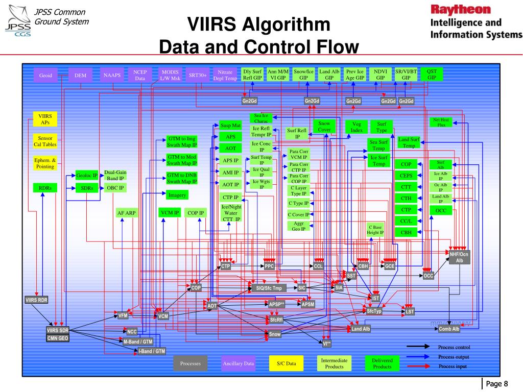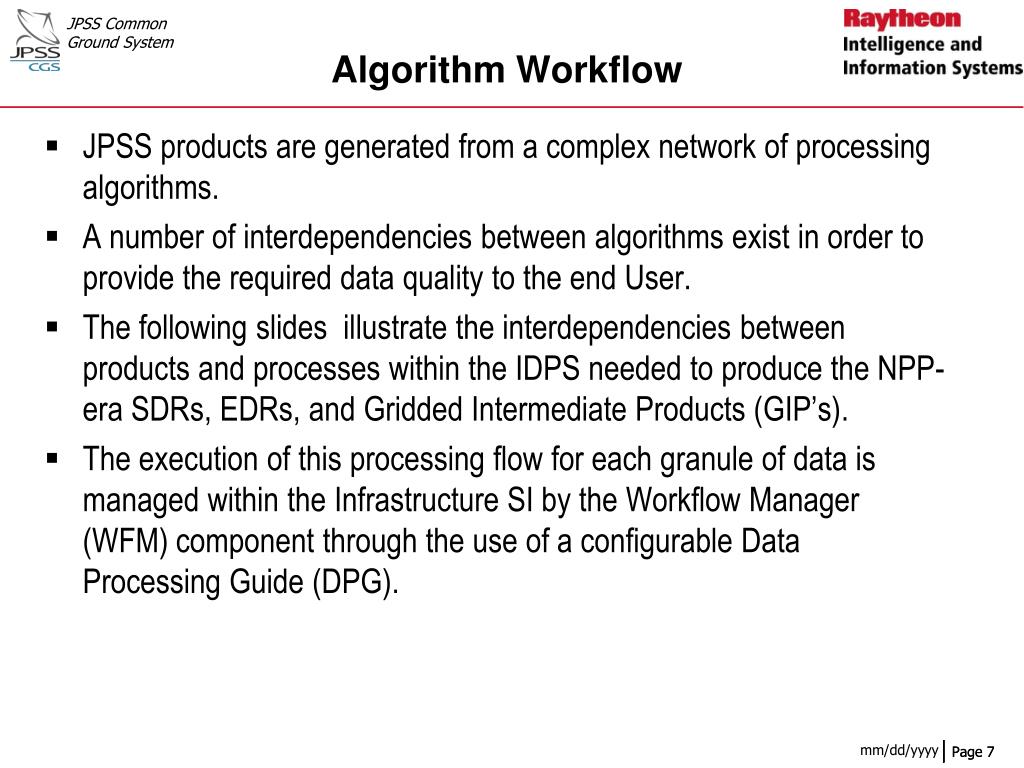 Algorithm Workflow • JPSS products are generated from a complex network of processing algorithms. • A number of interdependencies between algorithms exist in order to provide the required data quality to the end User. • The following slides illustrate the interdependencies between products and processes within the IDPS needed to produce the NPP-era SDRs, EDRs, and Gridded Intermediate Products (GIP’s). • The execution of this processing flow for each granule of data is managed within the Infrastructure SI by the Workflow Manager (WFM) component through the use of a configurable Data Processing Guide (DPG).