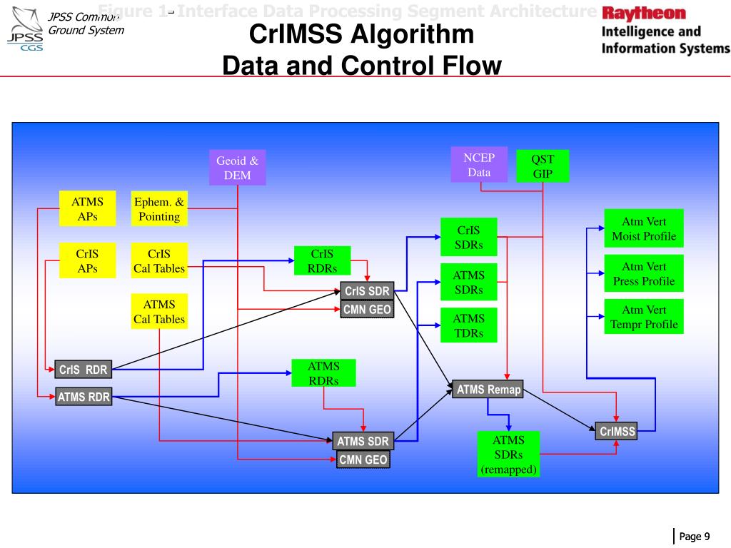 Figure 1 - - Interface Data Processing Segment Architecture CMN GEO CMN GEO - - CrIMSS Algorithm Data and Control Flow NCEP Data Geoid & DEM QST GIP ATMS APs Ephem. & Pointing Atm Vert Moist Profile CrIS SDRs CrIS APs CrIS Cal Tables CrIS RDRs Atm Vert Press Profile ATMS SDRs CrIS SDR ATMS Cal Tables Atm Vert Tempr Profile ATMS TDRs ATMS RDRs CrIS RDR ATMS Remap ATMS RDR CrIMSS ATMS SDRs (remapped) ATMS SDR