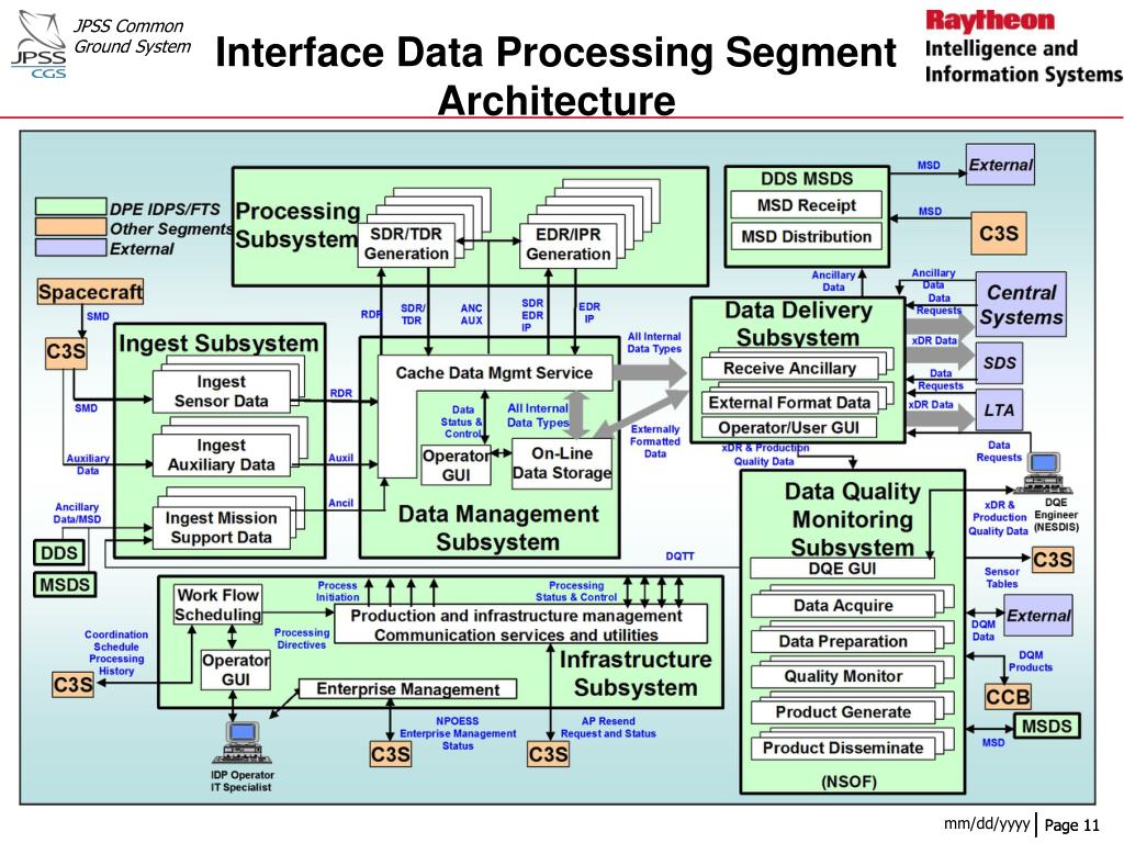 Mission Data Processing Capabilities • Mission data processing is performed by the Interface Data Processing Segment (IPDS) • The IDP segment combines software and hardware flexibility, expandability, and robustness to meet stringent performance requirements levied by the Joint Polar Satellite System Common Ground System (JPSS CGS) requirements. • Sensor application packets are passed to IDPS. The data stream is broken into granules, which are a subsectioning of the data stream into manageable time intervals. The granules of data can be processed in parallel by IDPS thus ensuring processing of high quality products within latency timelines.