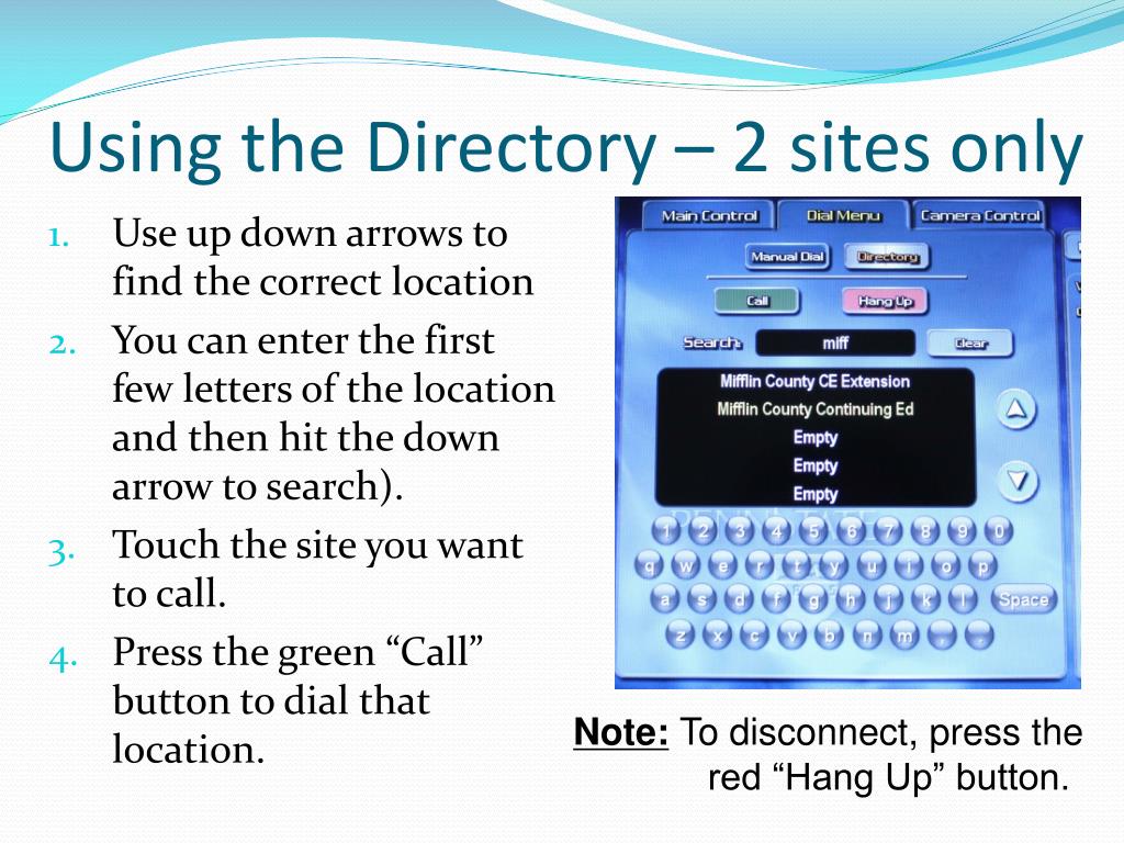 Using the Directory – 2 sites only • Use up down arrows to find the correct location • You can enter the first few letters of the location and then hit the down arrow to search). • Touch the site you want to call. • Press the green “Call” button to dial that location. Note:To disconnect, press the red “Hang Up” button.