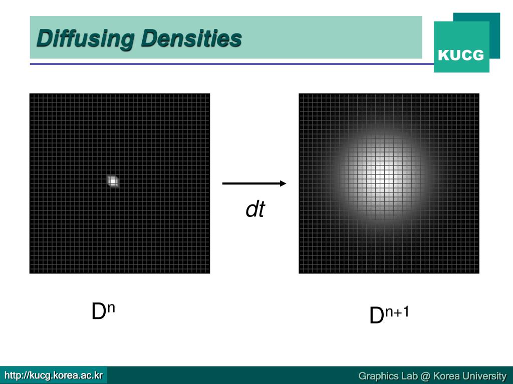 Diffusing Densities i,j+1 i-1,j i,j i+1,j i,j-1 Dn+1i,j = Dn i,j + k dt (Dn i-1,j + Dn i+1,j + Dn i,j-1 + Dn i,j+1 - 4Dn i,j)/h2