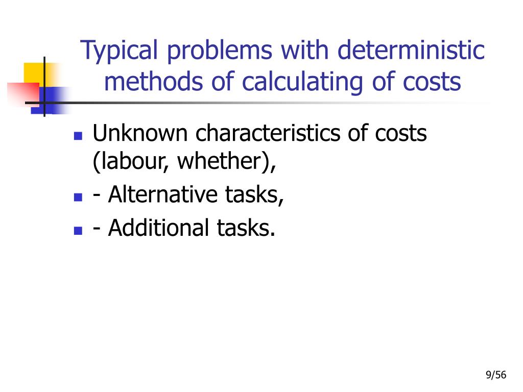 Typical problems with deterministic methods of calculating of costs • Unknown characteristics of costs (labour, whether), • - Alternative tasks, • - Additional tasks.
