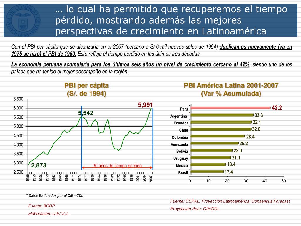 … lo cual ha permitido que recuperemos el tiempo pérdido, mostrando además las mejores perspectivas de crecimiento en Latinoamérica Con el PBI per cápita que se alcanzaría en el 2007 (cercano a S/.6 mil nuevos soles de 1994) duplicamos nuevamente (ya en 1975 se hizo) el PBI de 1950. Esto refleja el tiempo perdido en las últimas tres décadas. La economía peruana acumularía para los últimos seis años un nivel de crecimiento cercano al 42%, siendo uno de los países que ha tenido el mejor desempeño en la región. PBI per cápita (S/. de 1994) PBI América Latina 2001-2007 (Var % Acumulada) 30 años de tiempo perdido * Datos Estimados por el CIE - CCL Fuente: CEPAL, Proyección Latinoamérica: Consensus Forecast Proyección Perú: CIE/CCL Fuente: BCRP Elaboración: CIE/CCL