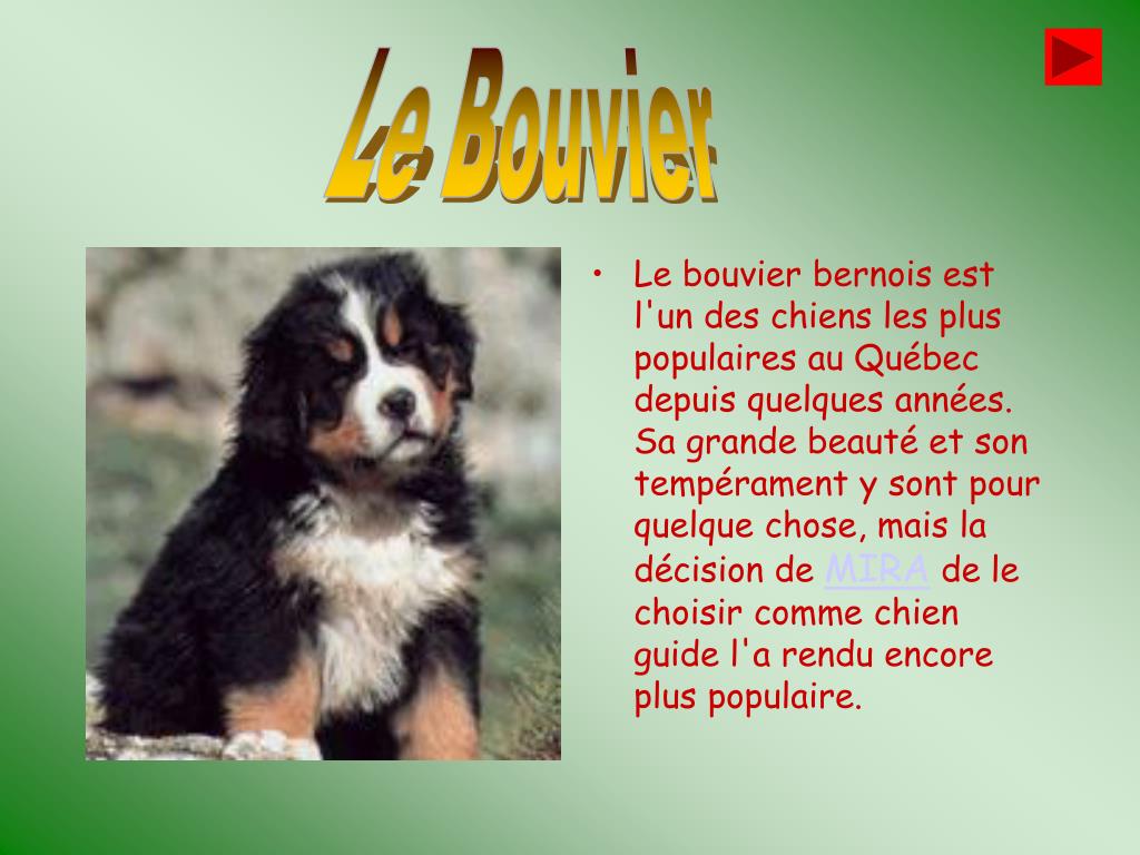 Le Bouvier • Le bouvier bernois est l'un des chiens les plus populaires au Québec depuis quelques années. Sa grande beauté et son tempérament y sont pour quelque chose, mais la décision de MIRA de le choisir comme chien guide l'a rendu encore plus populaire.