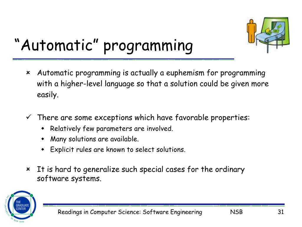 “Automatic” programming • Automatic programming is actually a euphemism for programming with a higher-level language so that a solution could be given more easily. • There are some exceptions which have favorable properties: • Relatively few parameters are involved. • Many solutions are available. • Explicit rules are known to select solutions. • It is hard to generalize such special cases for the ordinary software systems. Readings in Computer Science: Software Engineering