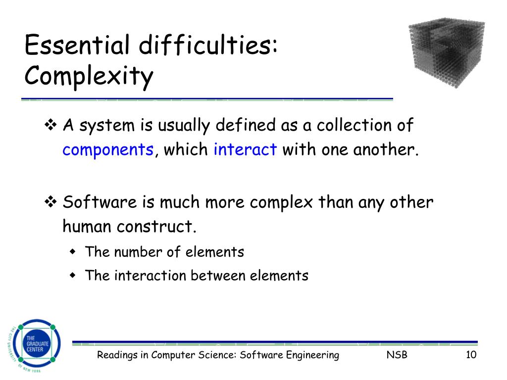 Essential difficulties: Complexity • A system is usually defined as a collection of components, which interact with one another. • Software is much more complex than any other human construct. • The number of elements • The interaction between elements Readings in Computer Science: Software Engineering