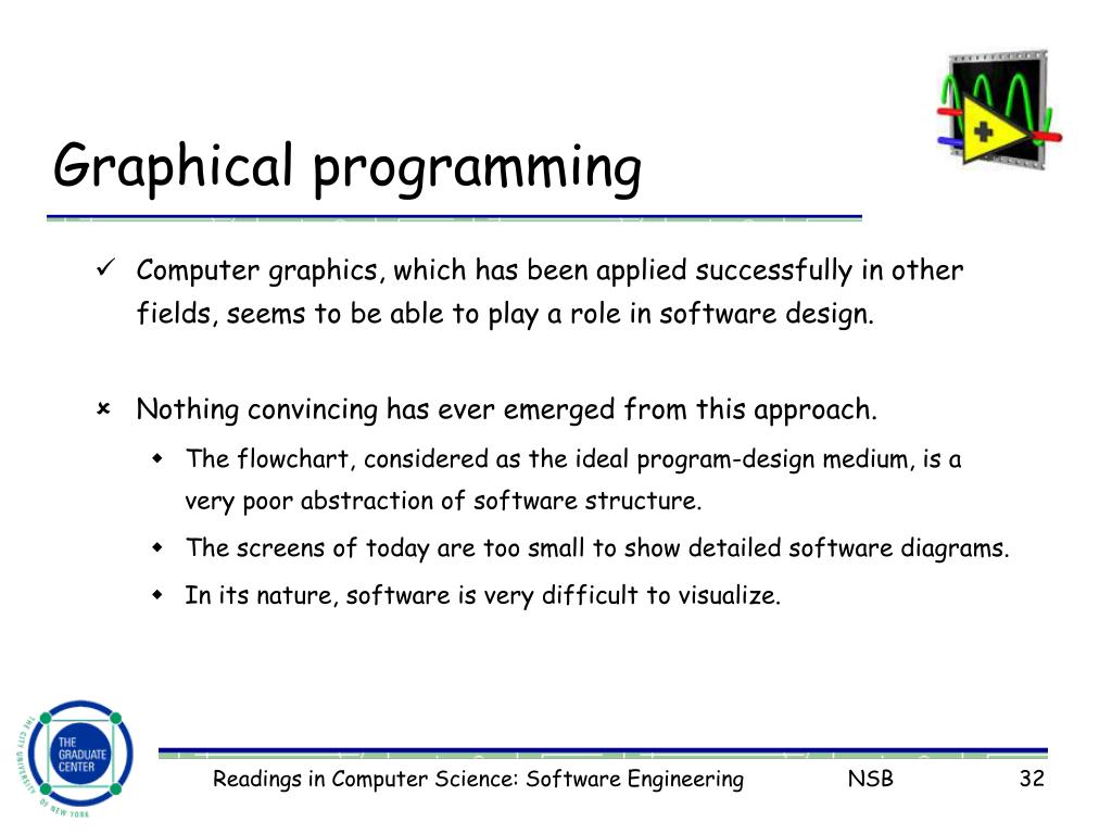 Graphical programming • Computer graphics, which has been applied successfully in other fields, seems to be able to play a role in software design. • Nothing convincing has ever emerged from this approach. • The flowchart, considered as the ideal program-design medium, is a very poor abstraction of software structure. • The screens of today are too small to show detailed software diagrams. • In its nature, software is very difficult to visualize. Readings in Computer Science: Software Engineering