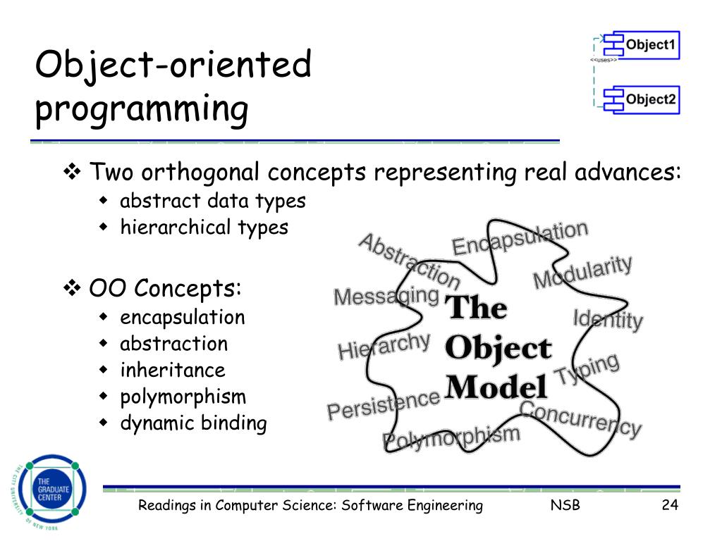 Object-oriented programming • Two orthogonal concepts representing real advances: • abstract data types • hierarchical types • OO Concepts: • encapsulation • abstraction • inheritance • polymorphism • dynamic binding Readings in Computer Science: Software Engineering