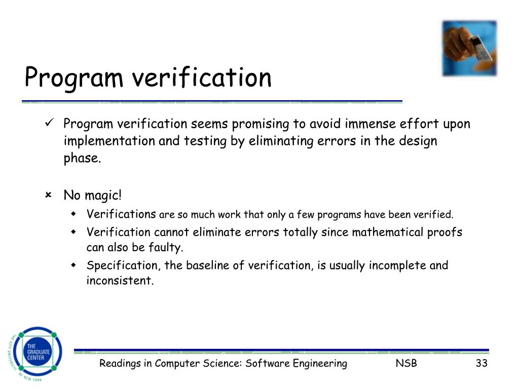 Program verification • Program verification seems promising to avoid immense effort upon implementation and testing by eliminating errors in the design phase. • No magic! • Verifications are so much work that only a few programs have been verified. • Verification cannot eliminate errors totally since mathematical proofs can also be faulty. • Specification, the baseline of verification, is usually incomplete and inconsistent. Readings in Computer Science: Software Engineering