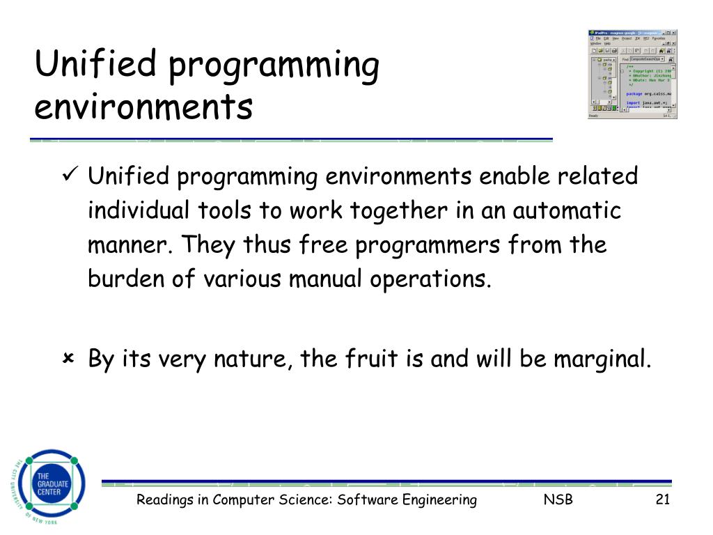 Unified programming environments • Unified programming environments enable related individual tools to work together in an automatic manner. They thus free programmers from the burden of various manual operations. • By its very nature, the fruit is and will be marginal. Readings in Computer Science: Software Engineering