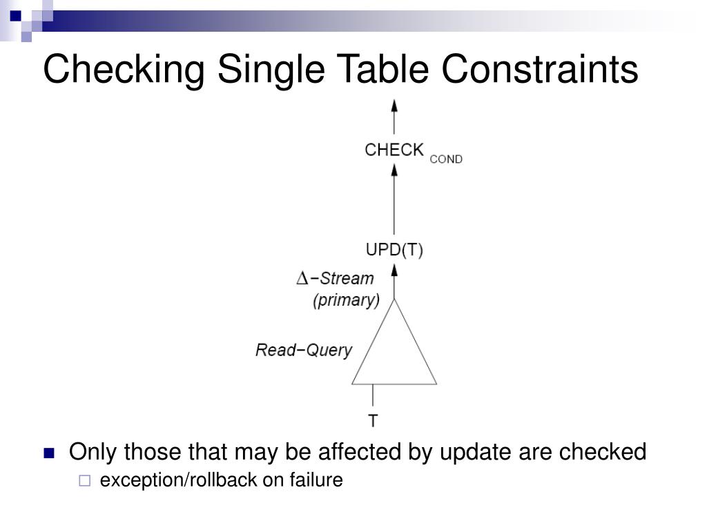 Checking Single Table Constraints • Only those that may be affected by update are checked • exception/rollback on failure