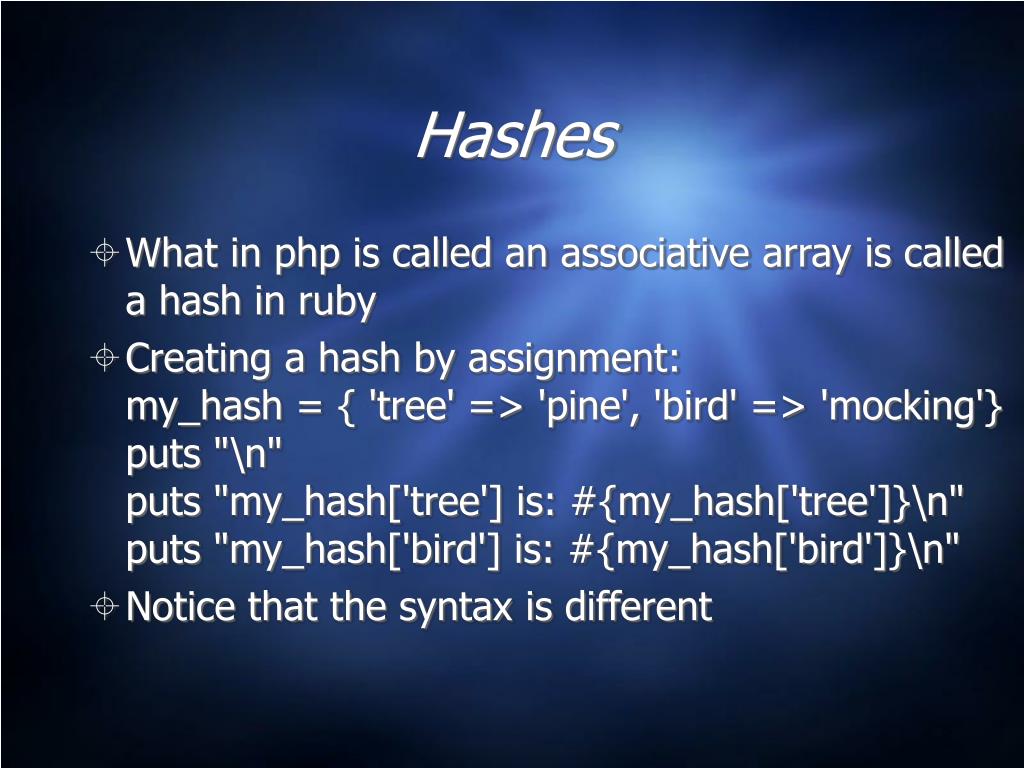 Hashes • What in php is called an associative array is called a hash in ruby • Creating a hash by assignment:my_hash = { 'tree' => 'pine', 'bird' => 'mocking'}puts "\n"puts "my_hash['tree'] is: #{my_hash['tree']}\n"puts "my_hash['bird'] is: #{my_hash['bird']}\n" • Notice that the syntax is different