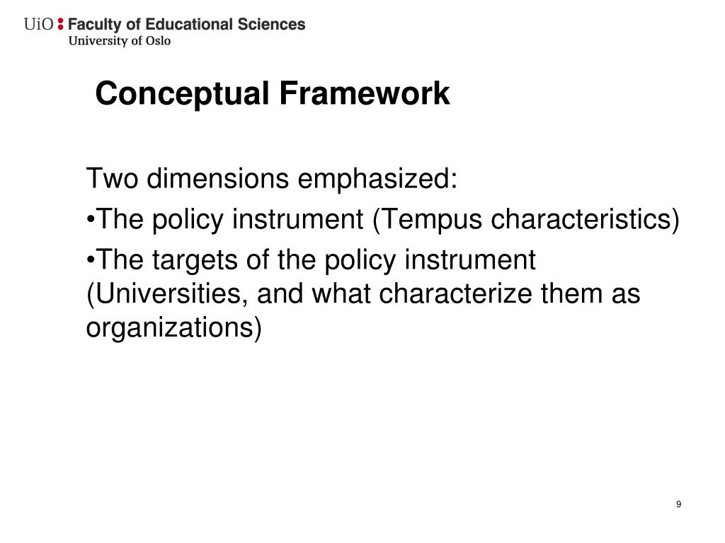 Conceptual Framework Two dimensions emphasized: • The policy instrument (Tempus characteristics) • The targets of the policy instrument (Universities, and what characterize them as organizations)