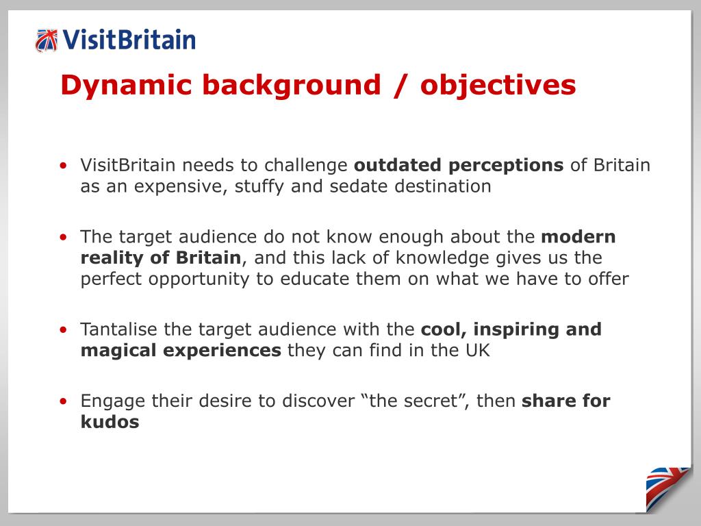 Dynamic background / objectives • VisitBritain needs to challenge outdated perceptions of Britain as an expensive, stuffy and sedate destination • The target audience do not know enough about the modern reality of Britain, and this lack of knowledge gives us the perfect opportunity to educate them on what we have to offer • Tantalise the target audience with the cool, inspiring and magical experiences they can find in the UK • Engage their desire to discover “the secret”, then share for kudos