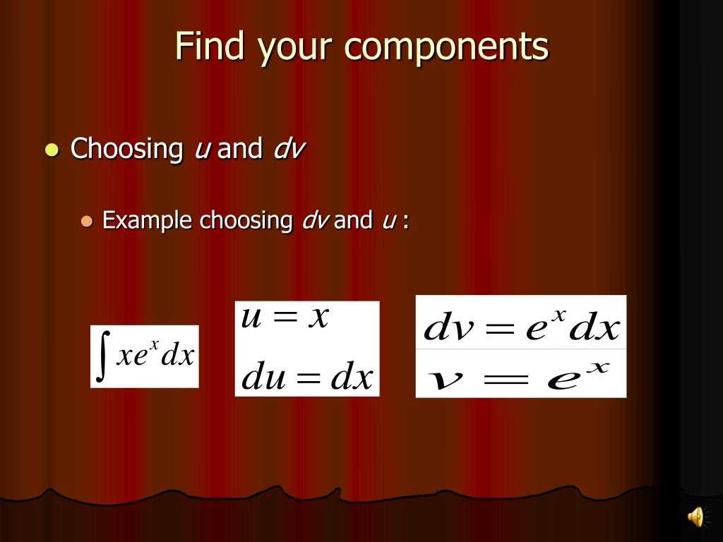 Find your components • Choosing u and dv • Example choosing dv and u :