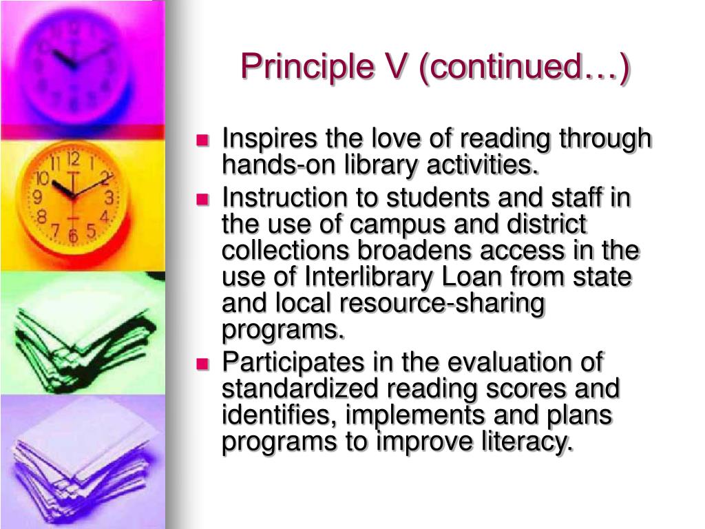 Principle V (continued…) • Inspires the love of reading through hands-on library activities. • Instruction to students and staff in the use of campus and district collections broadens access in the use of Interlibrary Loan from state and local resource-sharing programs. • Participates in the evaluation of standardized reading scores and identifies, implements and plans programs to improve literacy.