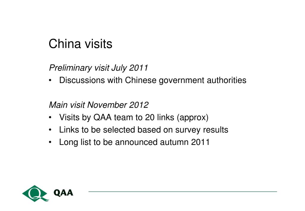 China visits Preliminary visit July 2011 • Discussions with Chinese government authorities Main visit November 2012 • Visits by QAA team to 20 links (approx) • Links to be selected based on survey results • Long list to be announced autumn 2011