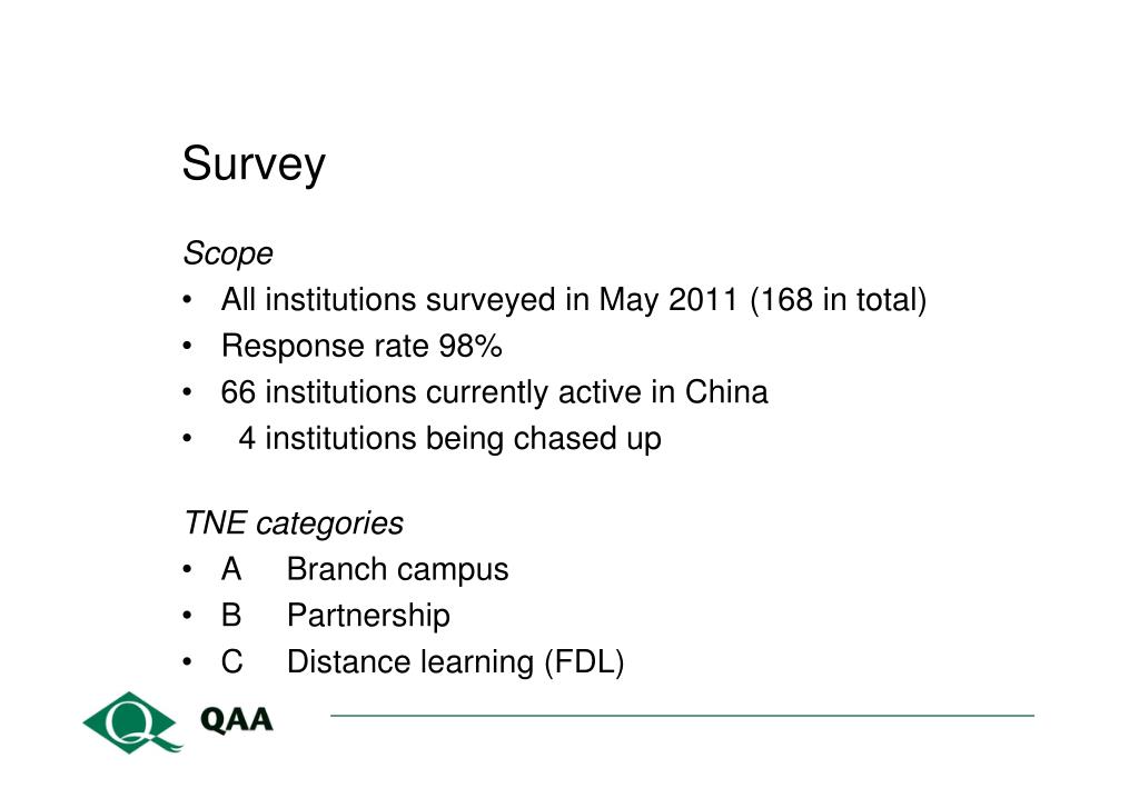 Desk-based study Target Basis Process When All HE institutions with significant TNE in China Standard information set (extant) Overview on activity from institution UK-based No visit to institution unless issues emerge Request for information set summer 2011 Institutions prepare information autumn 2011 QAA analyses information spring 2012