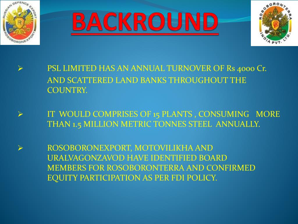 BACKROUND PSL LIMITED HAS AN ANNUAL TURNOVER OF Rs 4000 Cr. AND SCATTERED LAND BANKS THROUGHOUT THE COUNTRY. IT WOULD COMPRISES OF 15 PLANTS , CONSUMING MORE THAN 1.5 MILLION METRIC TONNES STEEL ANNUALLY. ROSOBORONEXPORT, MOTOVILIKHA AND URALVAGONZAVOD HAVE IDENTIFIED BOARD MEMBERS FOR ROSOBORONTERRA AND CONFIRMED EQUITY PARTICIPATION AS PER FDI POLICY.