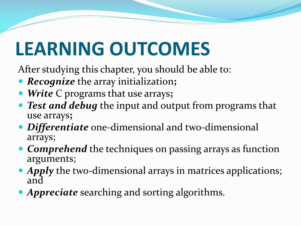 LEARNING OUTCOMES After studying this chapter, you should be able to: • Recognize thearray initialization; • Write C programs that use arrays; • Test and debug theinput and output from programs that use arrays; • Differentiate one-dimensional and two-dimensional arrays; • Comprehend the techniqueson passing arrays as function arguments; • Apply thetwo-dimensional arrays in matrices applications; and • Appreciate searching and sorting algorithms.