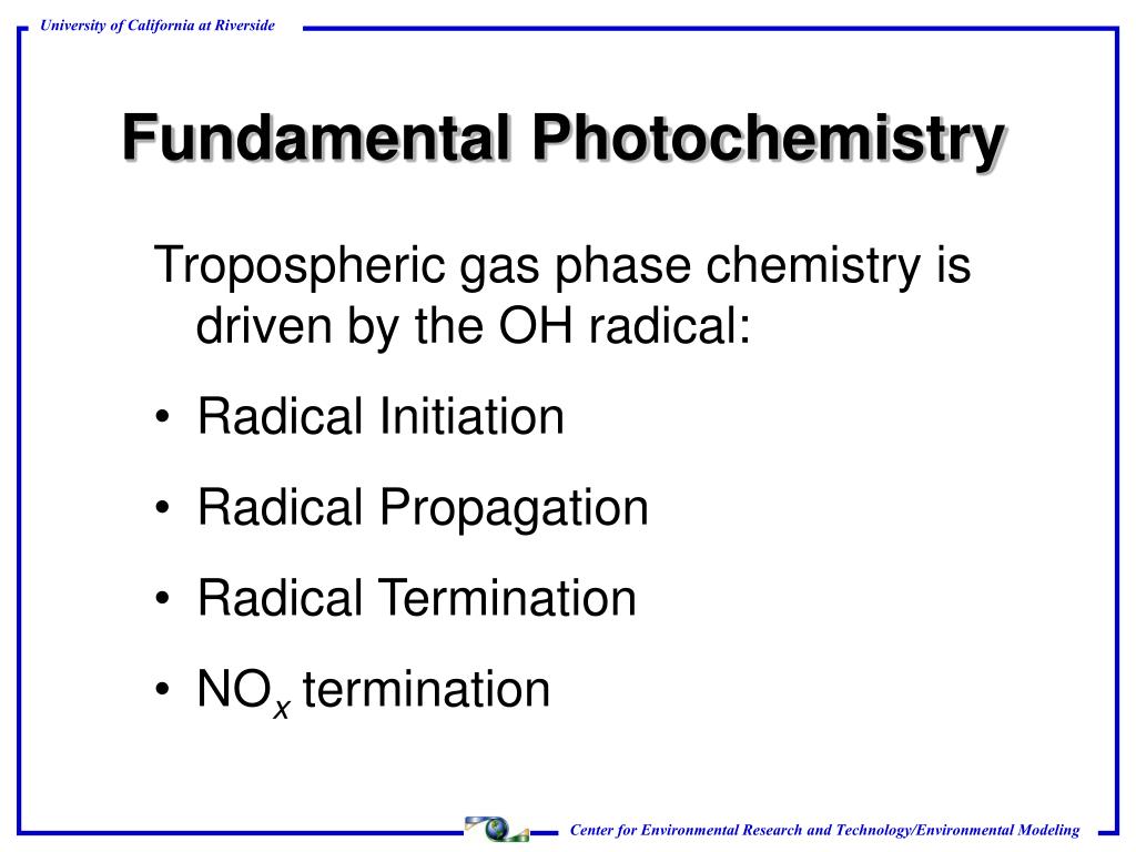 Fundamental Photochemistry Tropospheric gas phase chemistry is driven by the OH radical: • Radical Initiation • Radical Propagation • Radical Termination • NOx termination
